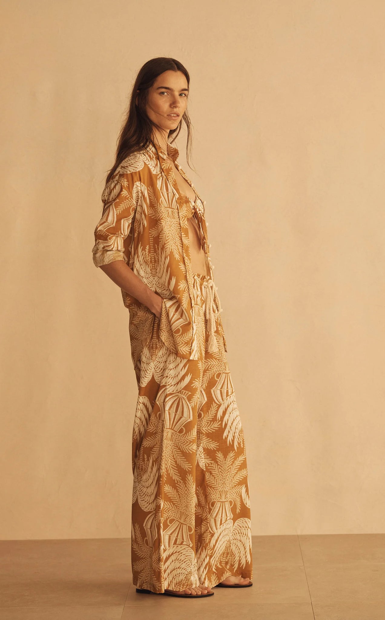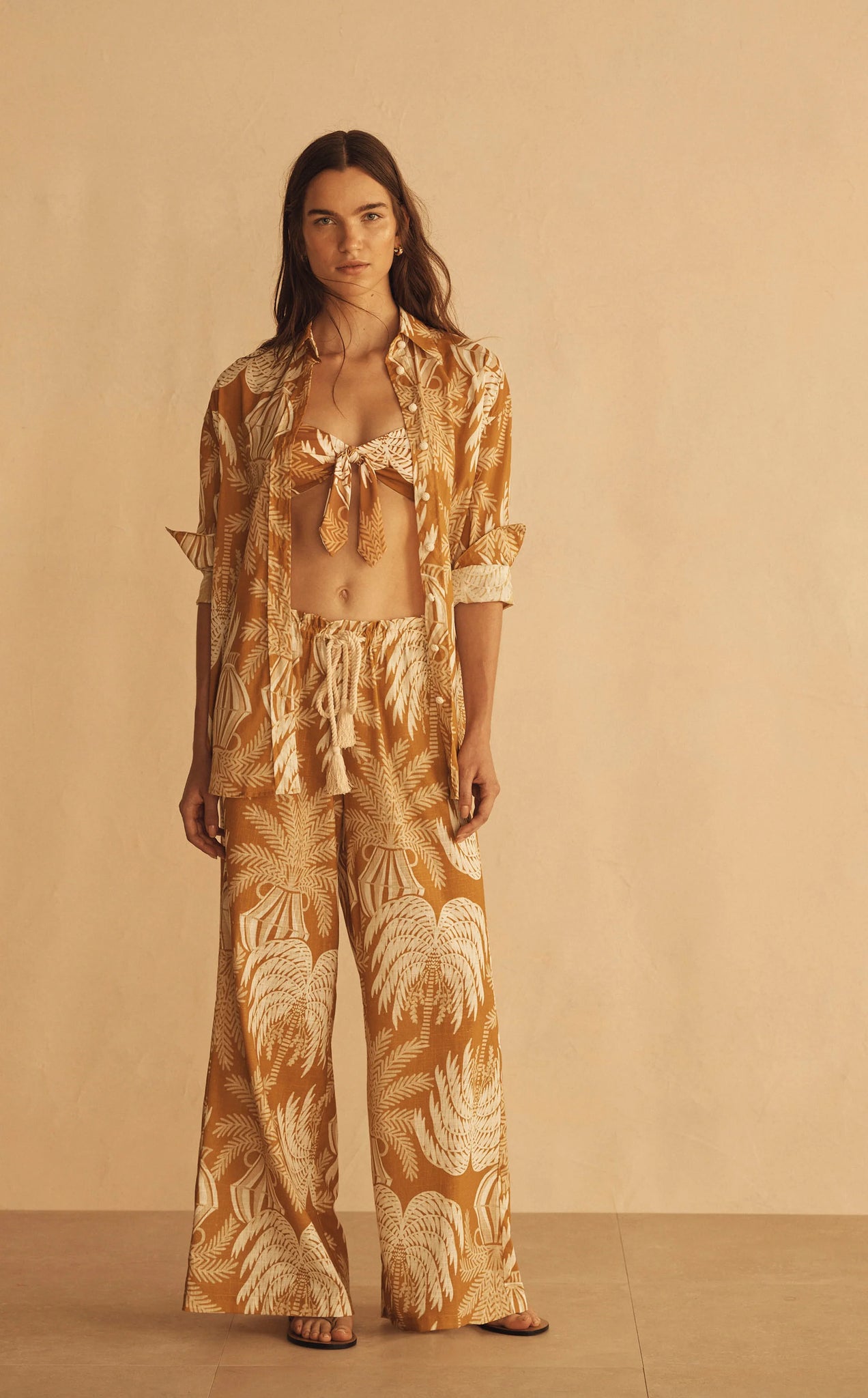 The Gathered Wide Leg Pant is a universally flattering and versatile silhouette. Featuring elasticated gathered waistband, centre-front rope tie drawstring and flared wide leg design. Style with matching Long Sleeve Shirt to create the perfect summer set.
