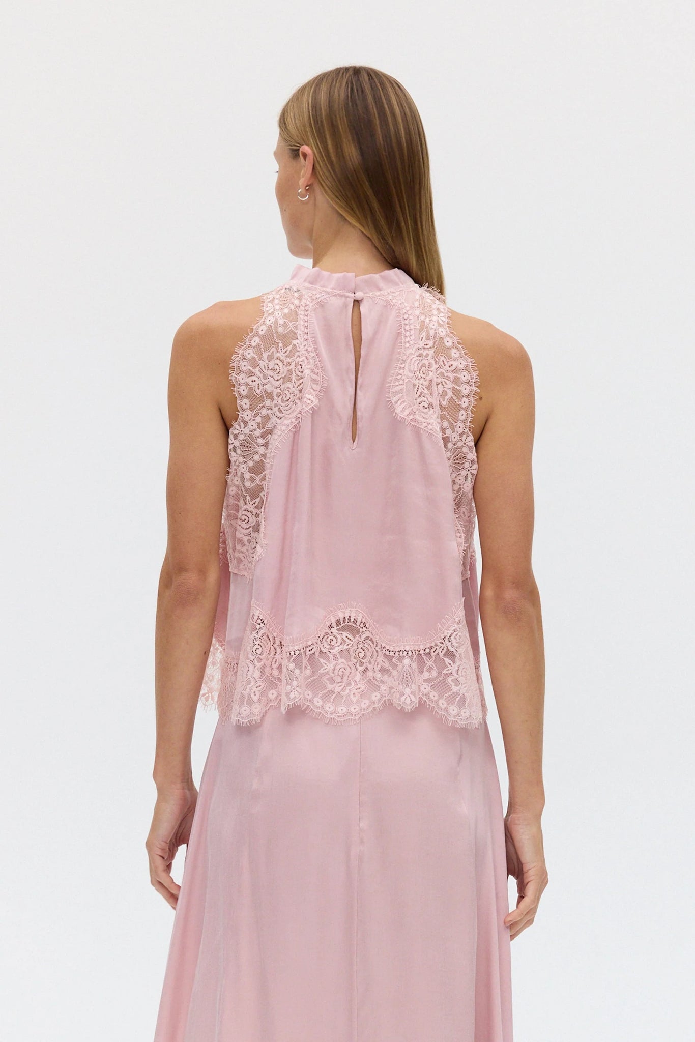 Crafted in sandwashed Cupro, the Visions Lace Top in blends delicate craftsmanship with modern elegance. A high neckline and softly gathered bodice create a fluid drape, while intricate lace paneling traces the shoulders and hem, adding a touch of romance. Designed for versatile styling, this sleeveless silhouette flows effortlessly, making it the perfect pairing for both tailored and relaxed separates.