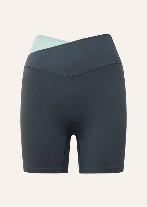 The Wander 5” Bike Short in Thunder & Dusty Mint is made in our Studio Soft fabrication, a lightly peached fabric with a matte finish. This high rise 5” bike short features a flattering contrast crossover detail at the waistband. Style this bike short with the matching Wander Bra to complete the look.