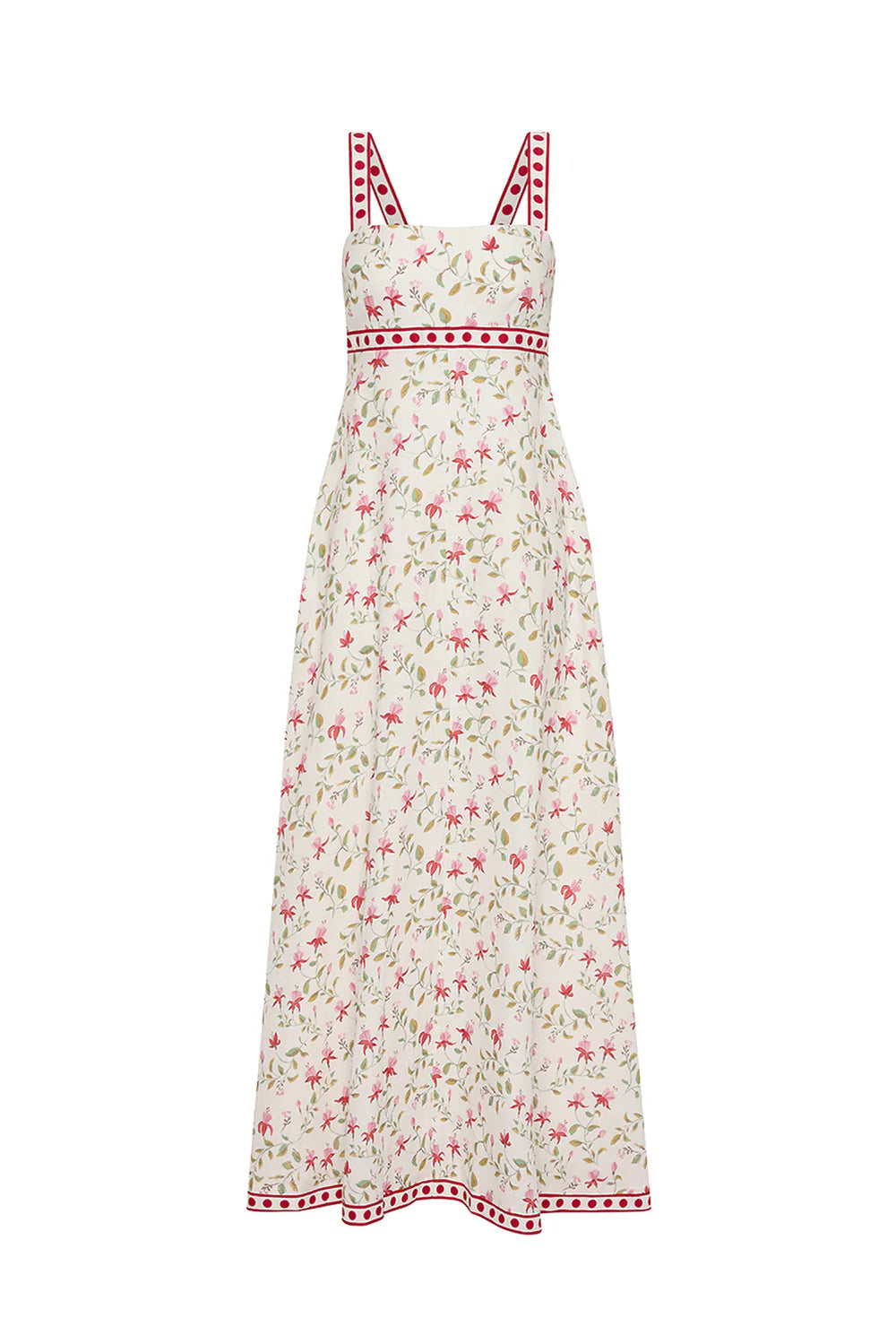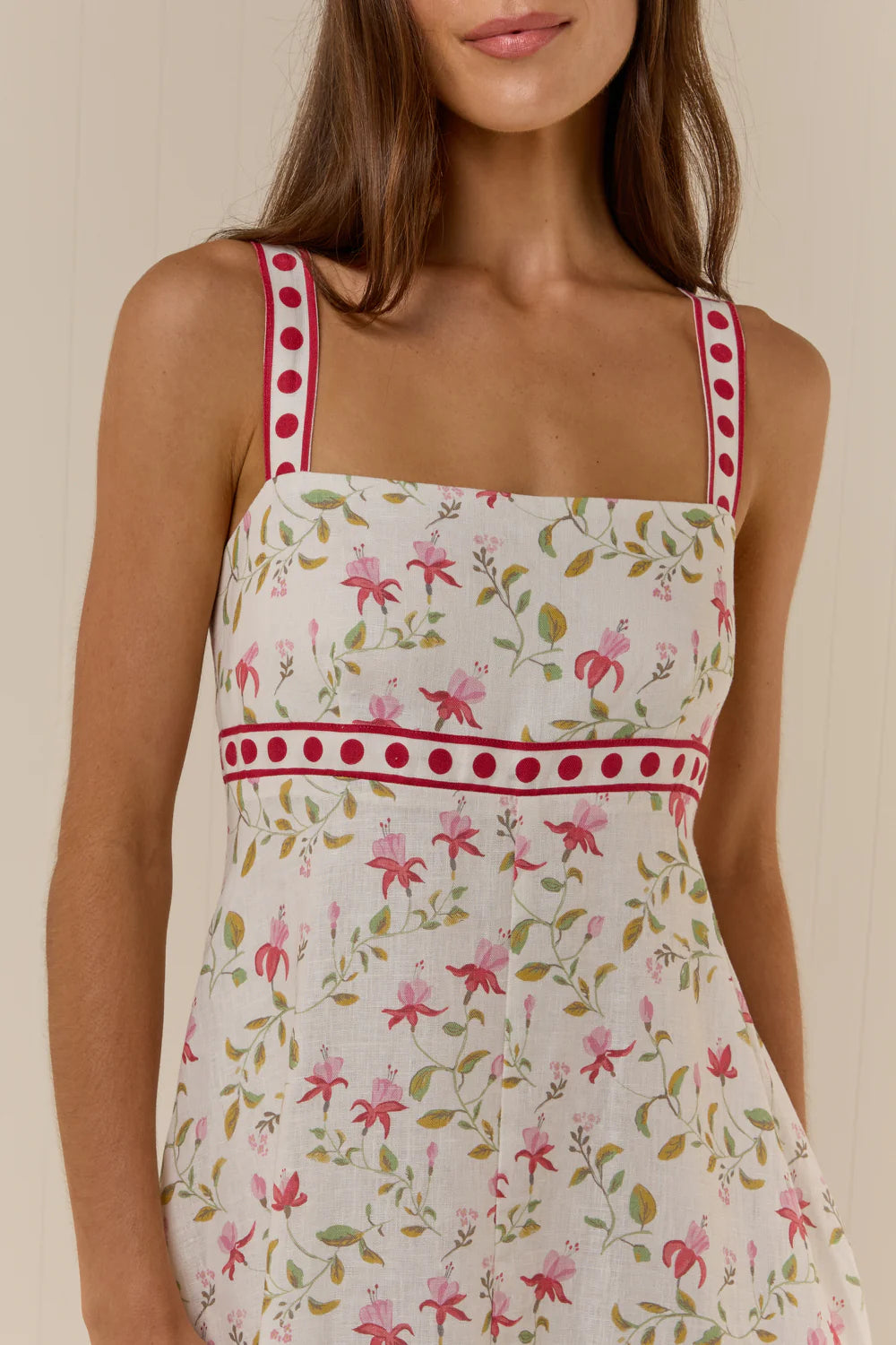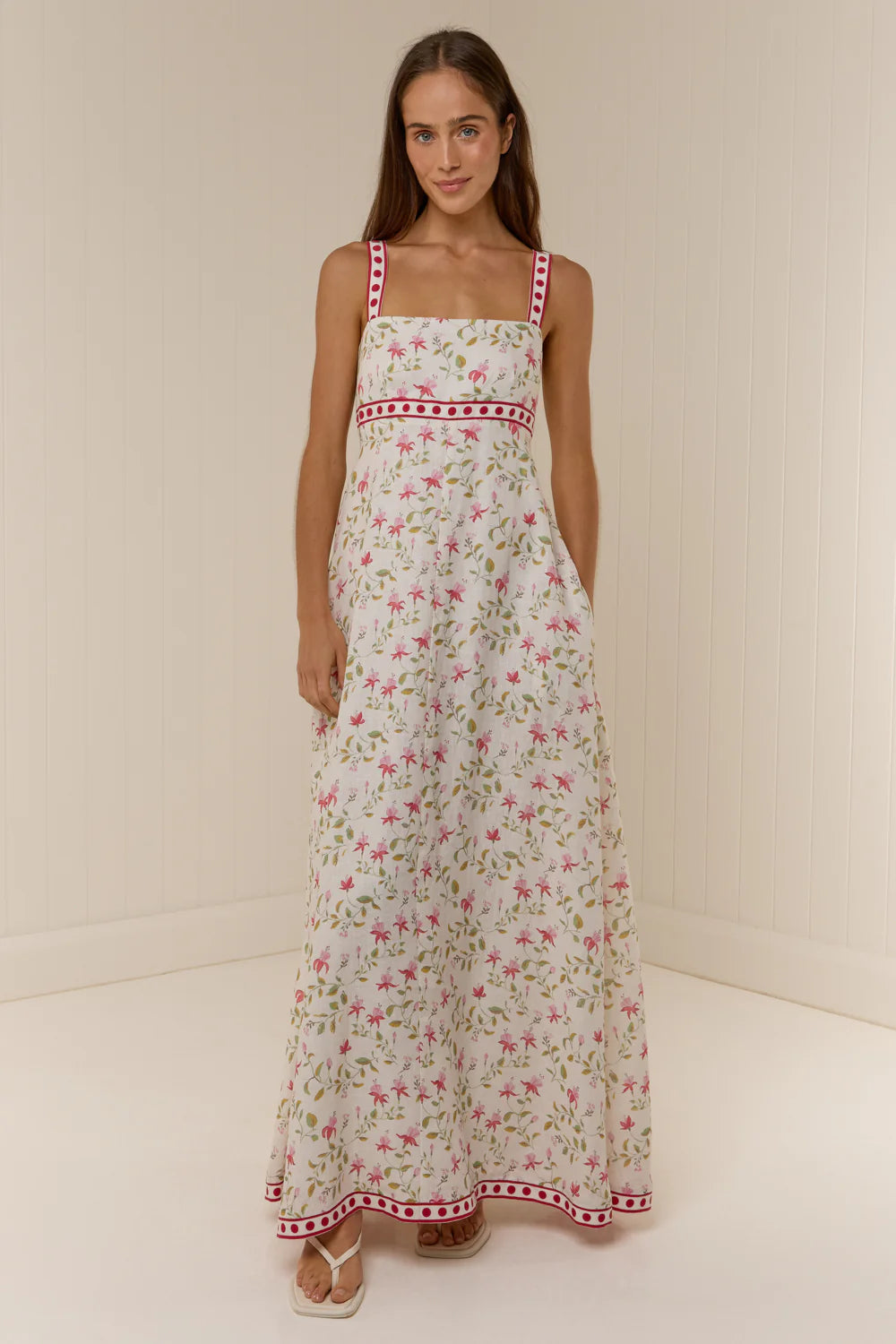The Belle Dress is a new maxi silhouette crafted from a premium Linen in our exclusive Pink Petals print. Featuring a square neckline, fitted bust and contrast border detailing, the Belle Dress flows into an A-line skirt for an elevated, feminine fit. Please refer to our size and fit guide for further fit details