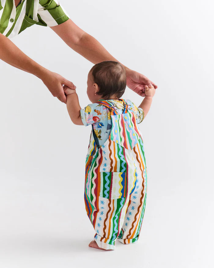 Ready for action! Our Beach Patterns Baby Cotton Drill Overalls are made for mini adventurers with big energy. Made from sturdy printed cotton drill, featuring columns of lines, squiggles and star spotted patterns in a rainbow of colours, these little all-rounders are perfect for crawling, toddling, and all-day exploring. With adjustable straps and handy leg snaps for quick nappy changes (because nobody’s got time for a wrestle), they’re as practical as they are adorable. Layer over a tee, our short sleeve rompers or nothing at all, these overalls bring the fun no matter how you style them!