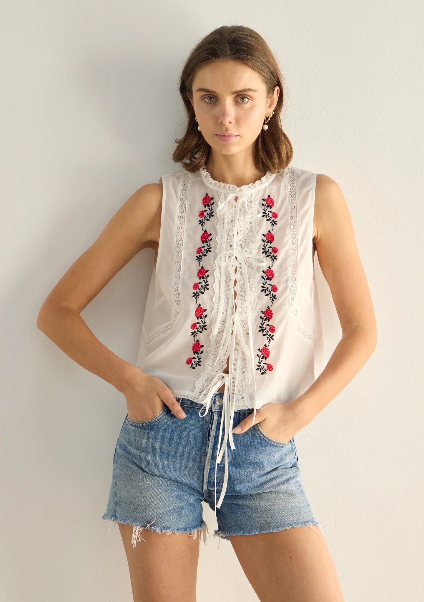 The Bellamy Embroidered Blouse in black, with contrast hand-embroidered red roses, is your denim’s new best friend. In a super-flattering tank silhouette, no detail has been spared—intricate embroidery, delicate pin tucks, lace touches, and functional ties—crafted from deliciously soft organic cotton. A sweet, artisanal piece made to brighten every warm day.