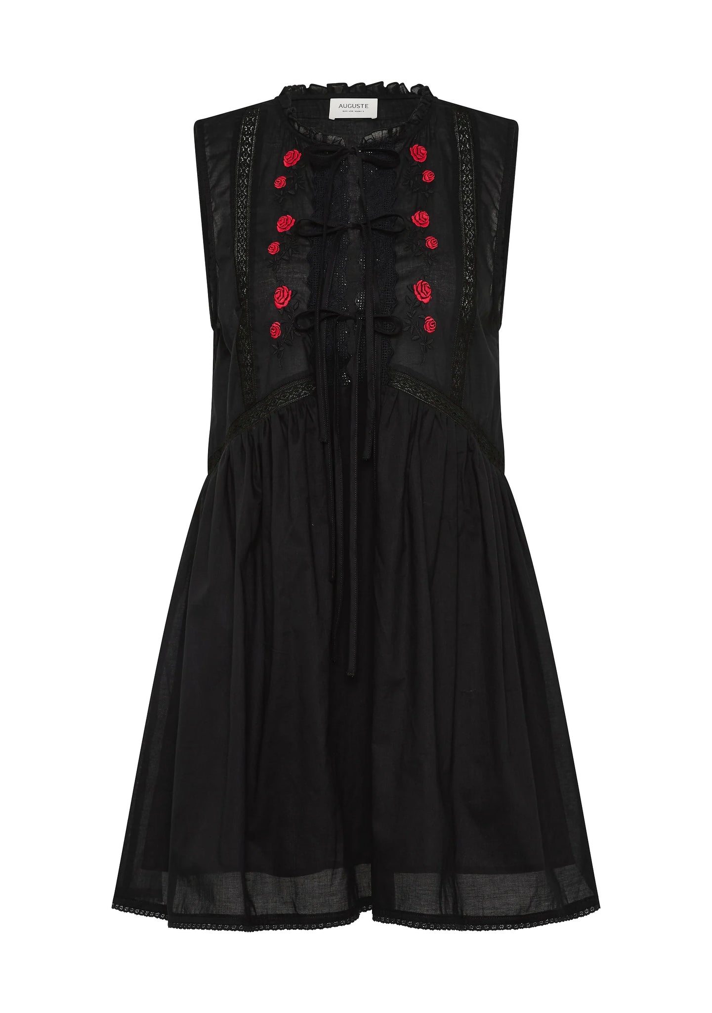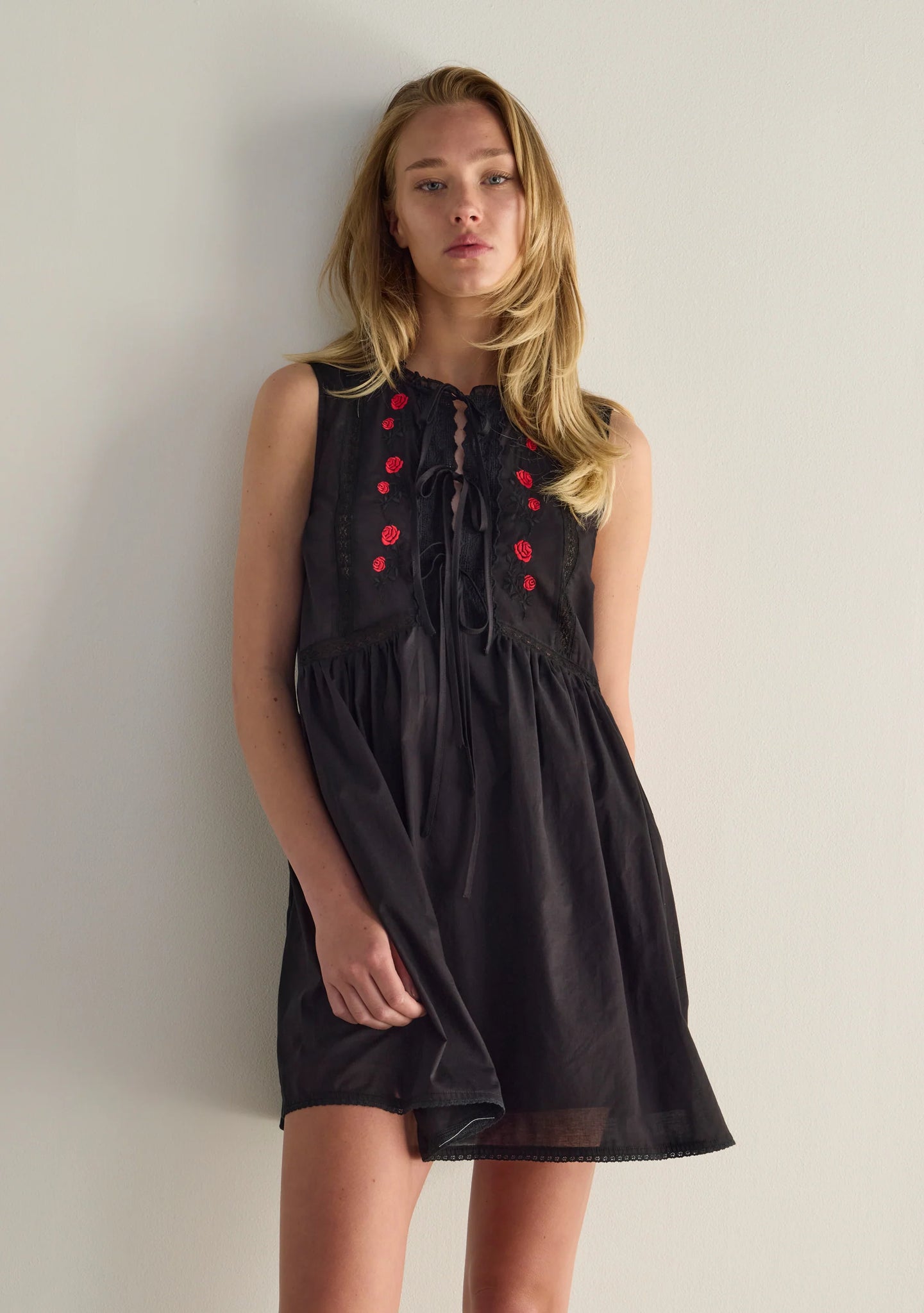 The Bellamy Mini Dress in black, with contrast hand-embroidered red roses, is your playful summer essential. Designed in a super-flattering babydoll silhouette, no detail has been spared—intricate embroidery, delicate pin tucks, lace touches, and functional ties—crafted from deliciously soft organic cotton. A sweet, artisanal piece made to brighten every warm day.