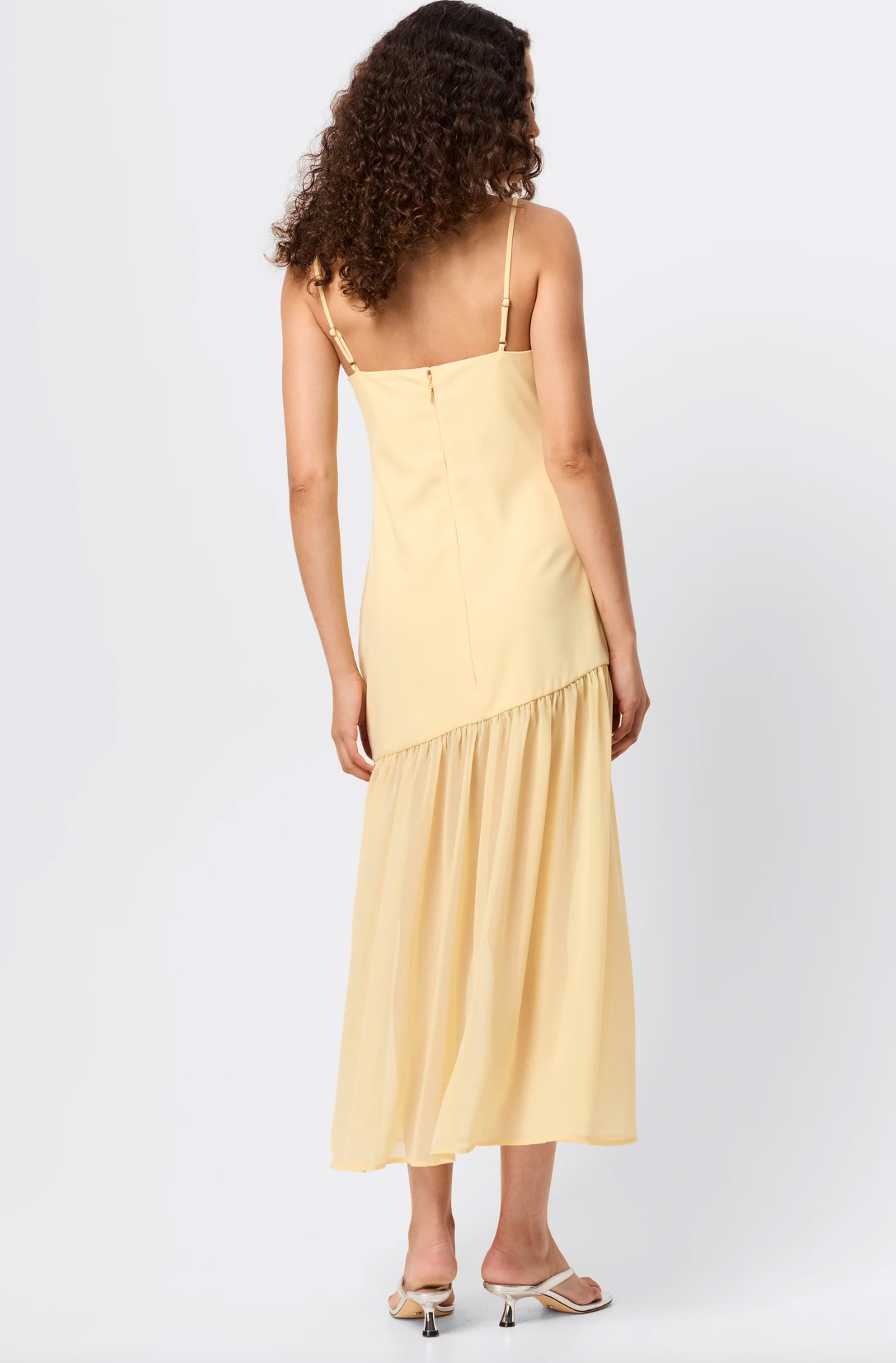 Elegant and understated, the Beyond The Horizon Midi Dress in Butter redefines effortless femininity. Crafted with a fitted bodice and V-neckline, this dress features subtle bust darts for shape and structure. Falling to a soft, voluminous hem in a sheer contrast fabrication, it creates graceful movement with every step. A refined piece that transitions seamlessly from day to evening with a simple change of accessories.
