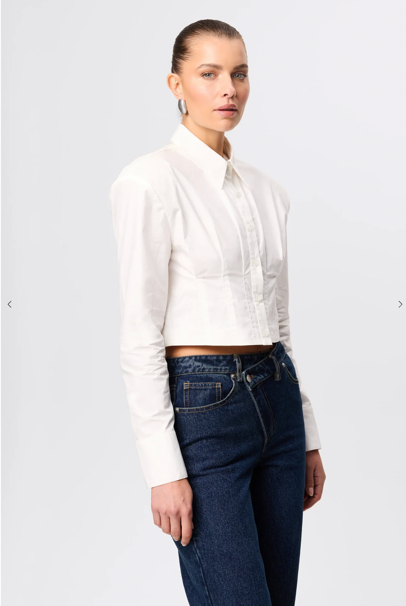 The Darcy Shirt in White redefines classic tailoring with a modern, structured edge. Crafted from crisp cotton, it features shoulder pads for a sharp silhouette, a collared neckline, and an exposed button-front closure. The cropped length and topstitch detailing at the fitted waist create a flattering shape, while long sleeves with buttoned cuffs complete the polished look. A contemporary essential that transitions effortlessly from office to evening.