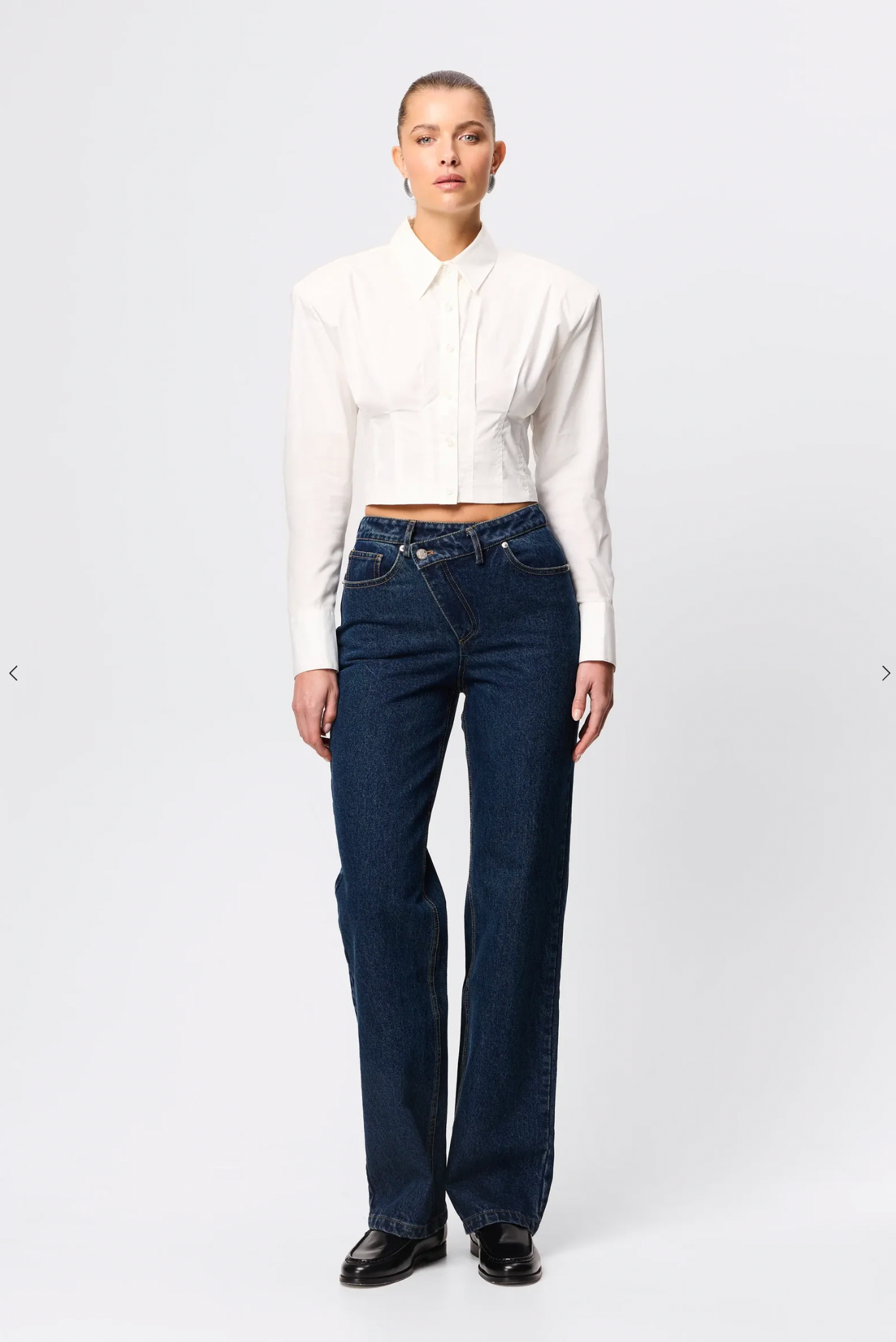 - Cropped length with topstitch detailing