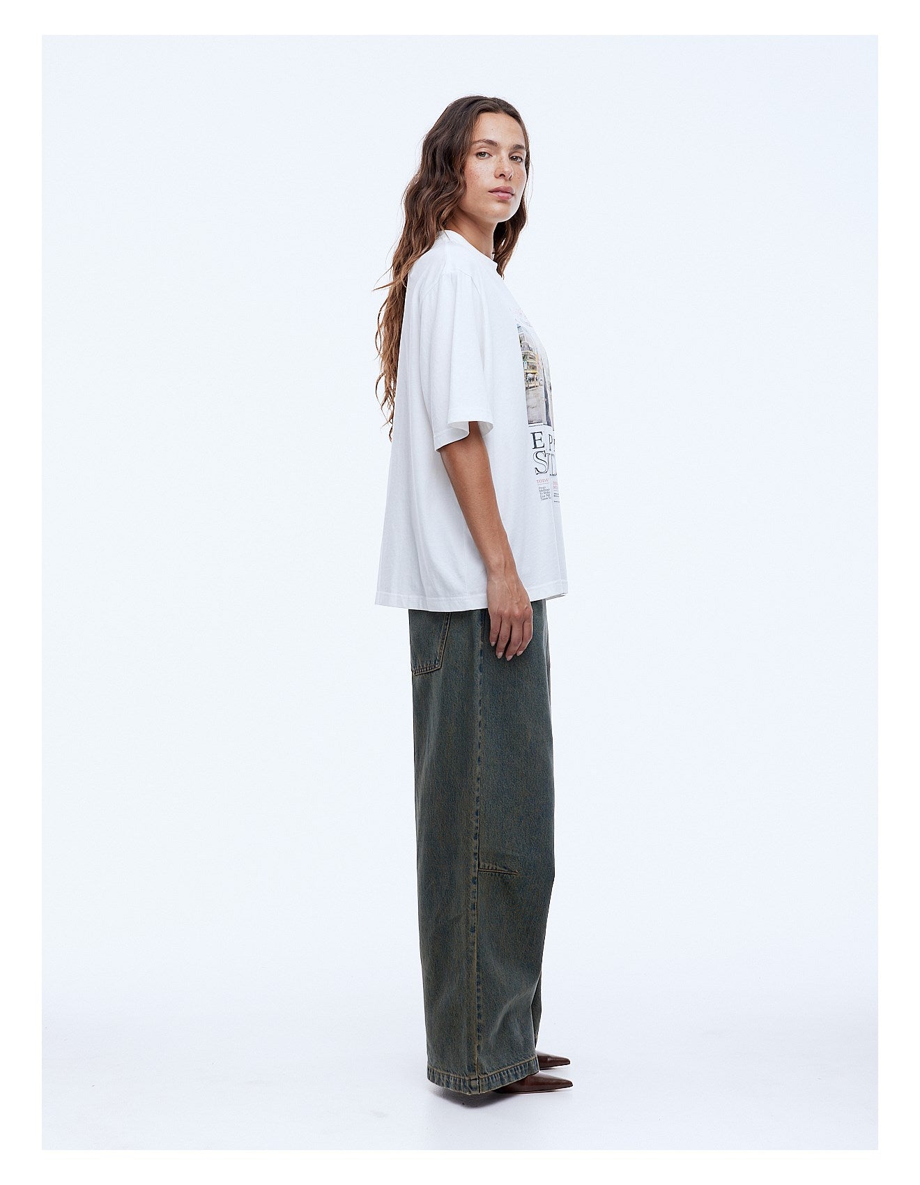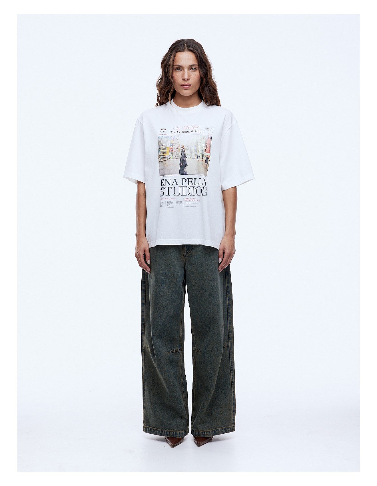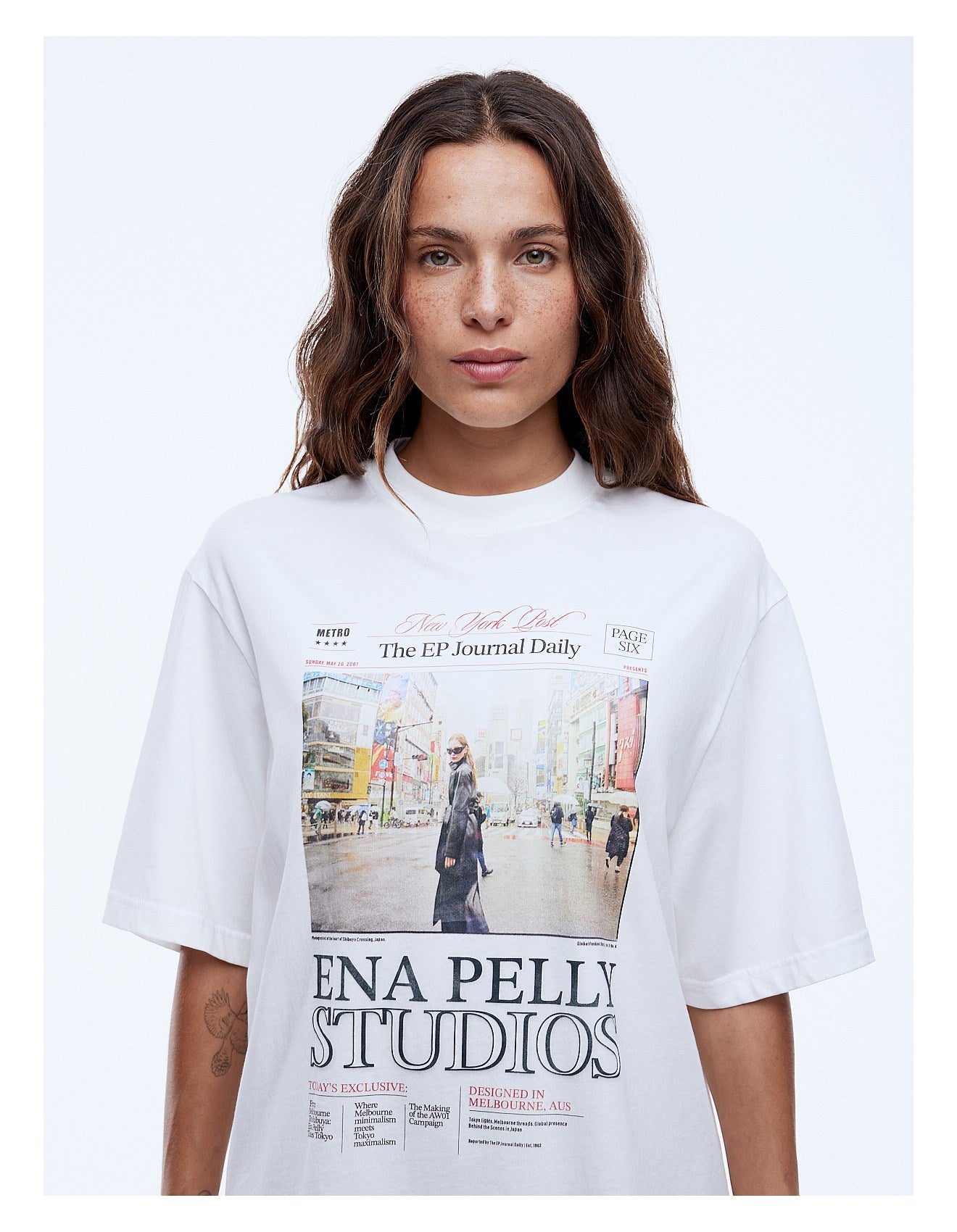 The EP Journal Tee is cut from soft cotton jersey in vintage white with a boxy, relaxed shape. Finished with a newspaper-inspired front graphic and vintage wash, this drop-shoulder tee delivers effortless street energy with a lived-in feel.