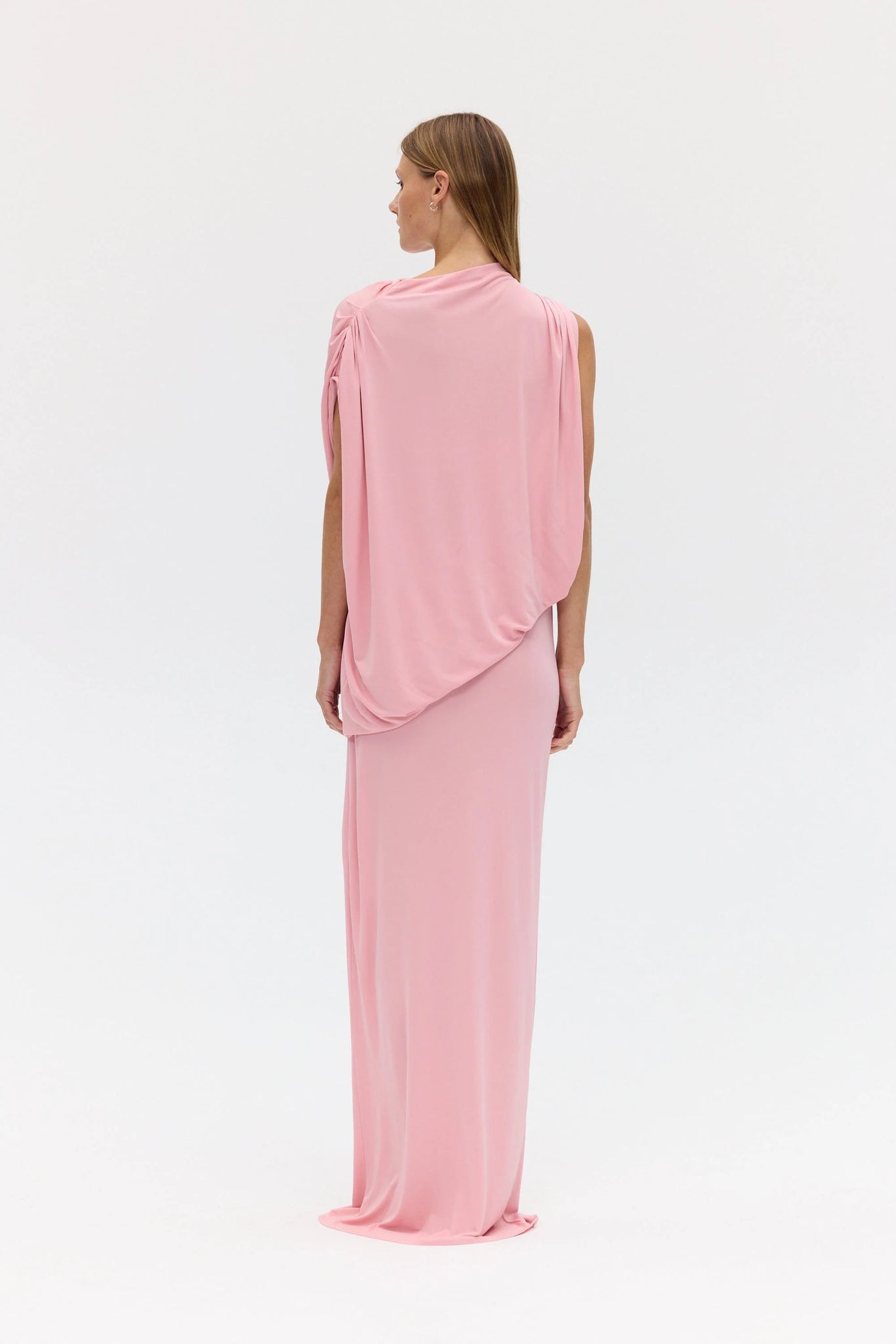 The Fall Away Floor Length Dress explores fluid form and directional drape. Defined by an asymmetric shoulder line, the bodice features soft tucks through the shoulder seam and a slight funnel neckline that frames the silhouette. The draped bodice falls to meet the skirt at the waist, creating a gathered interplay of structure and ease, while the wearer’s right side reveals an open cut-out for a sense of movement.