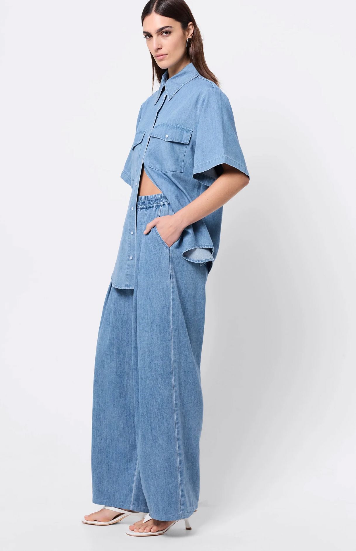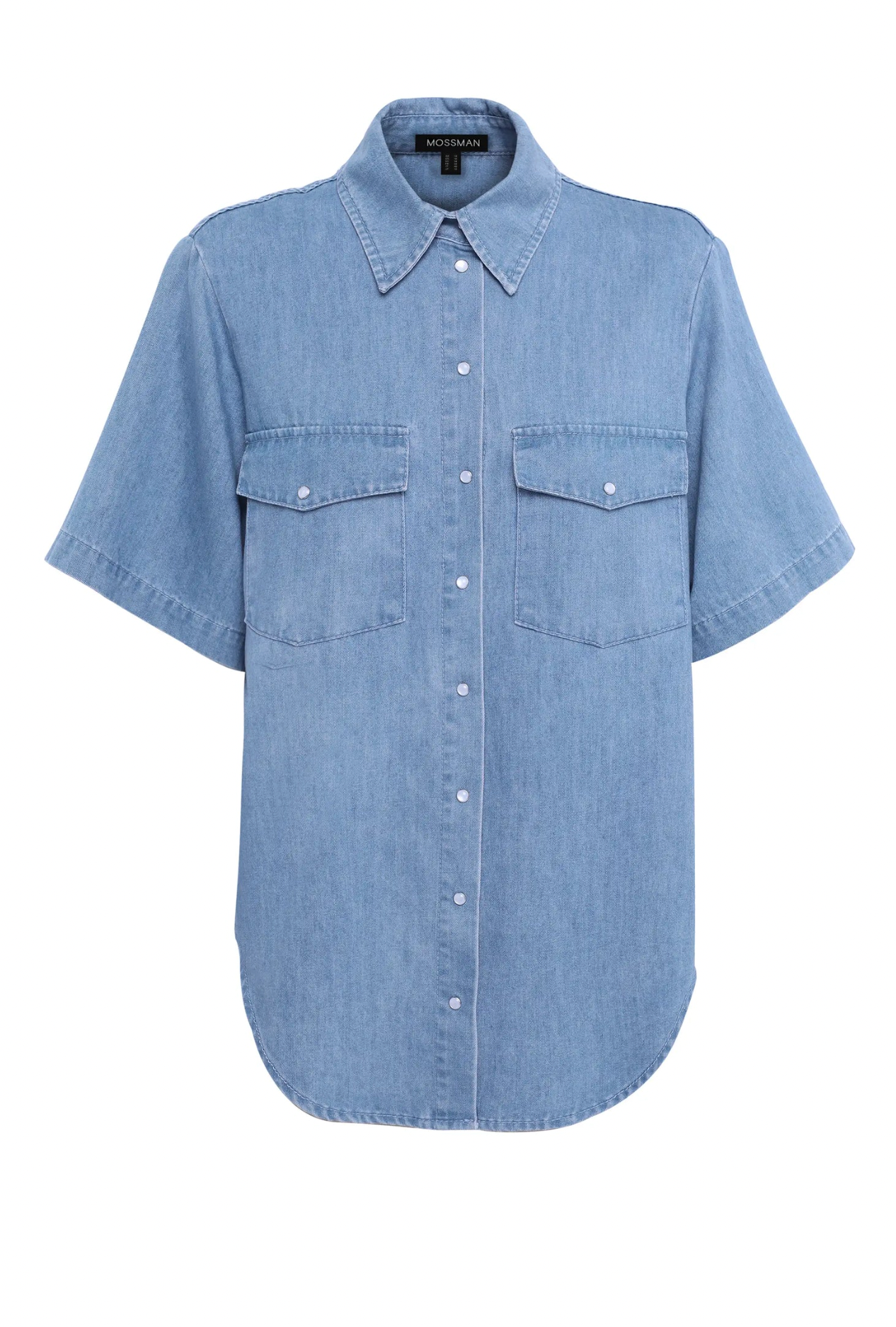 A timeless essential reimagined for modern dressing, the High Tide Shirt in Blue brings effortless versatility to your wardrobe. Crafted from a premium chambray fabrication, this relaxed silhouette features a collared neckline, short sleeves, and a waved hemline for a contemporary edge. Designed with patch pocket detailing and pearlescent snap button closures, it offers the perfect balance of structure and ease. Pair with the matching High Tide Pant for a coordinated look, or style open with a tank and denim for relaxed sophistication.