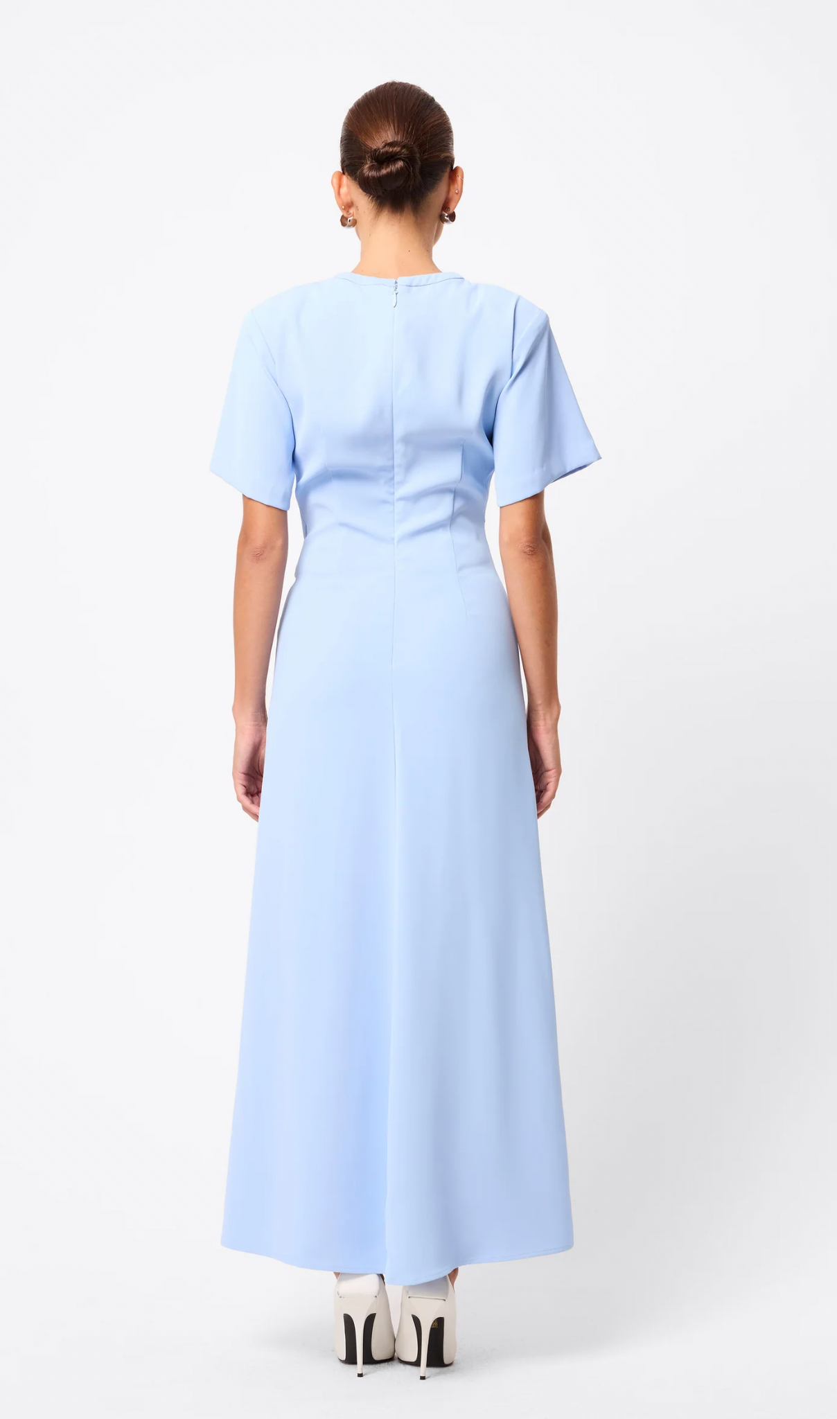 The Infusion Dress in cool blue delivers timeless elegance with a contemporary edge. Designed with a relaxed crew neckline, short sleeves, and asymmetric fixed ruching through the front, this maxi silhouette offers an off-body flattering, feminine fit. Versatile and chic, it’s perfect for a range of occasions — from daytime events and summer lunches to evening gatherings — with styling that can be easily dressed up or down.