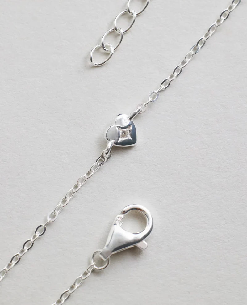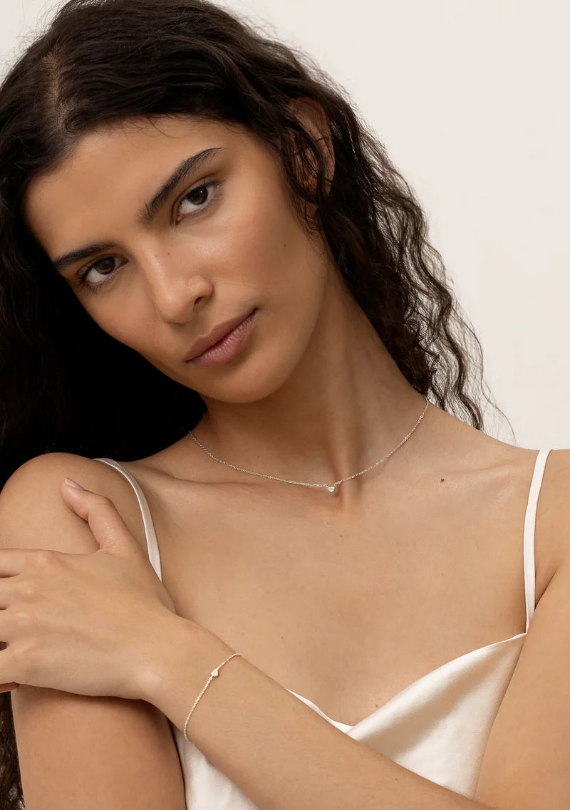 The Mini Heart Bracelet features a dainty heart shaped pendant embellished with a single stone, suspended on a fine chain. Inspired by the E. E. Cummings poem, ‘I Carry Your Heart with Me’, this meaningful piece is perfect for every day adornment or a cherished gift.