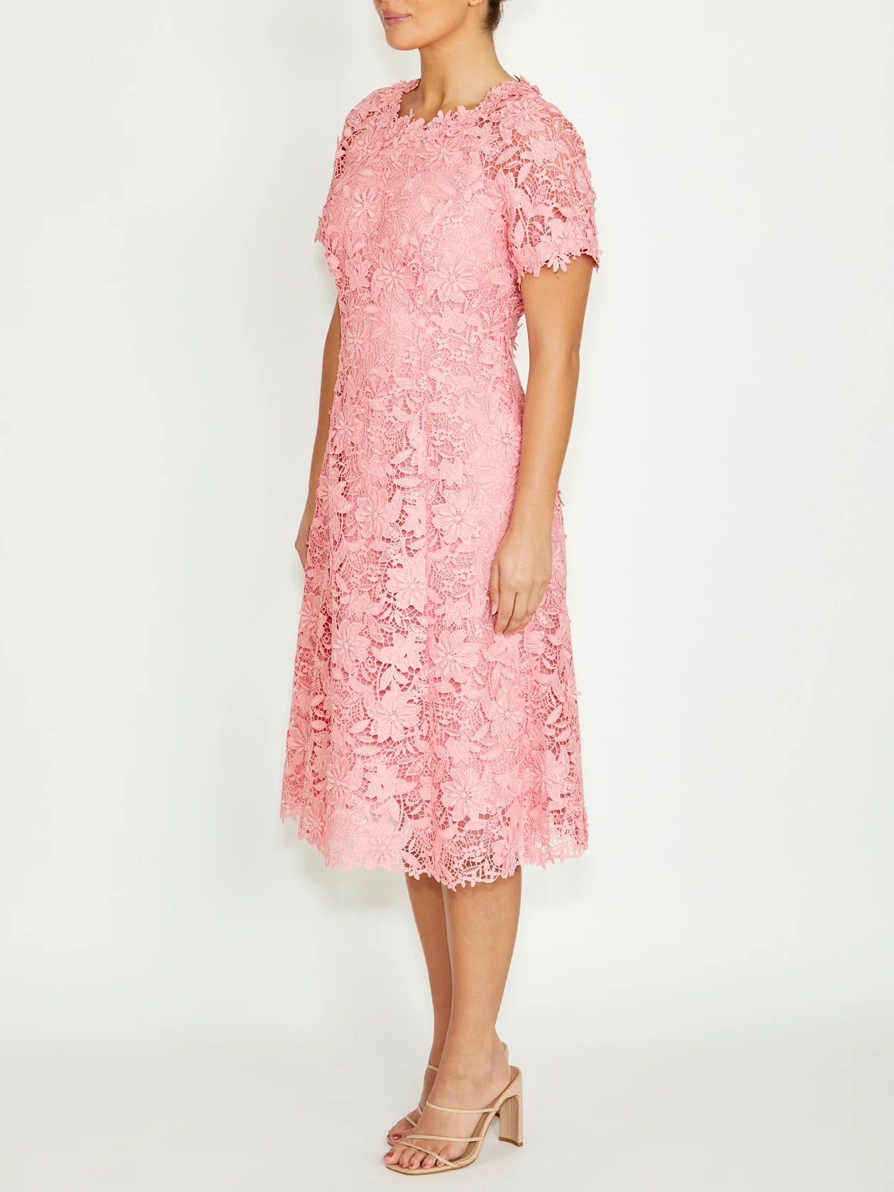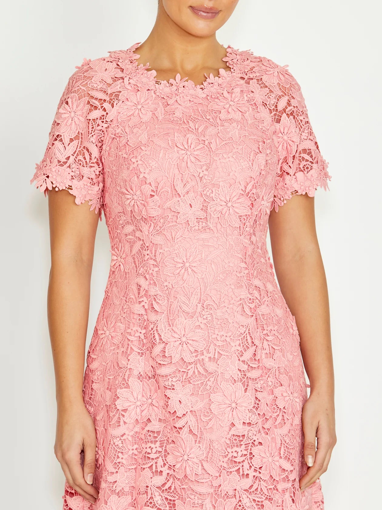 Exude timeless charm in this pink guipure lace dress, featuring scalloped edges at the neckline and sleeves for a soft, feminine finish. The fit-and-flare silhouette flatters all body types, making it ideal for both daytime celebrations and evening events. Finished with a centre back zip, this mid-length dress blends elegance and ease for any special occasion.