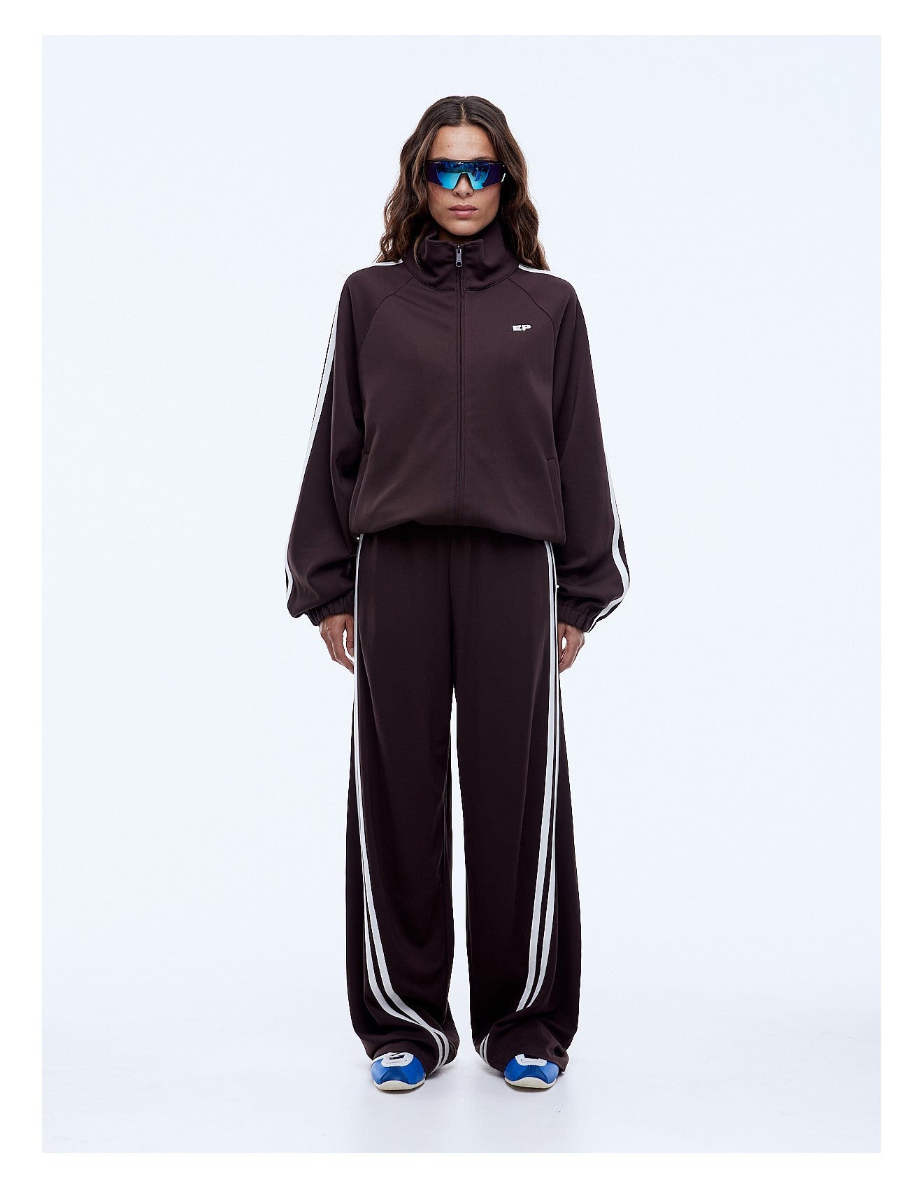 The Valentina Zip Thru is crafted in a smooth rayon blend with a relaxed, sporty silhouette, finished in cocoa for an elevated everyday layer. Designed with a two-way zip, raglan sleeves and contrast sleeve stripe detailing, it features elasticated cuffs and an adjustable hem with drawcord toggles to wear loose or cinched. Welt pockets and stacked Ena Pelly logo prints complete the confident, street ready feel.