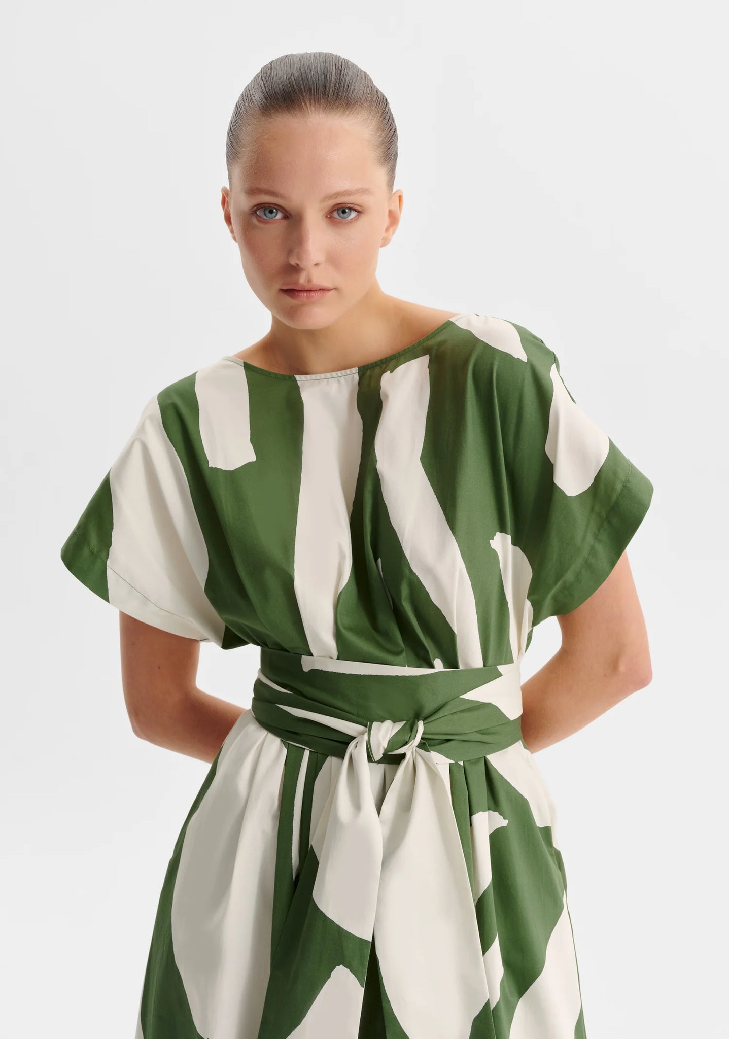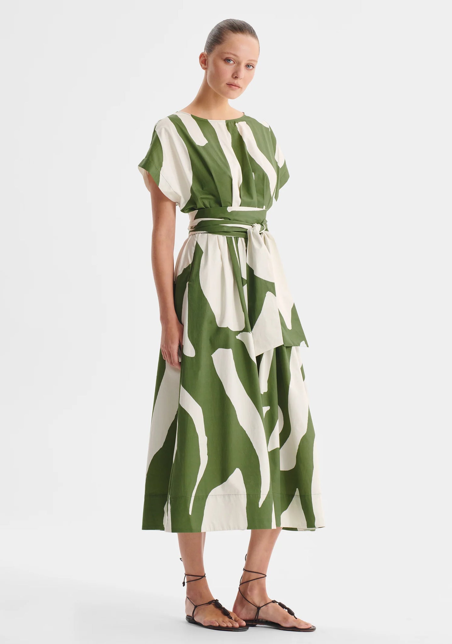 - Includes double length self fabric waist tie