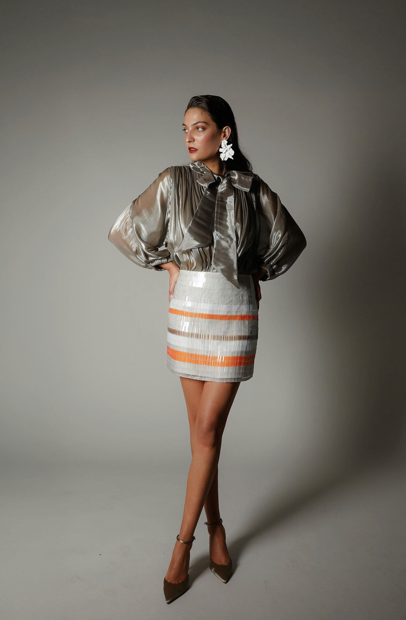 The Atelier Bow Top invites a soft sense of drama into everyday dressing. Crafted from a semi-sheer, delicately textured Japanese satin, featuring an adjustable neck tie and shoulder panels framed with piping detail. Softly voluminous 3/4 sleeves, elasticated cuffs, and gathering through the front and back bodice create a fluid drape that moves with ease. Designed with soft volume and considered structure, the Atelier Bow Top blends modern femininity with contemporary refinement.