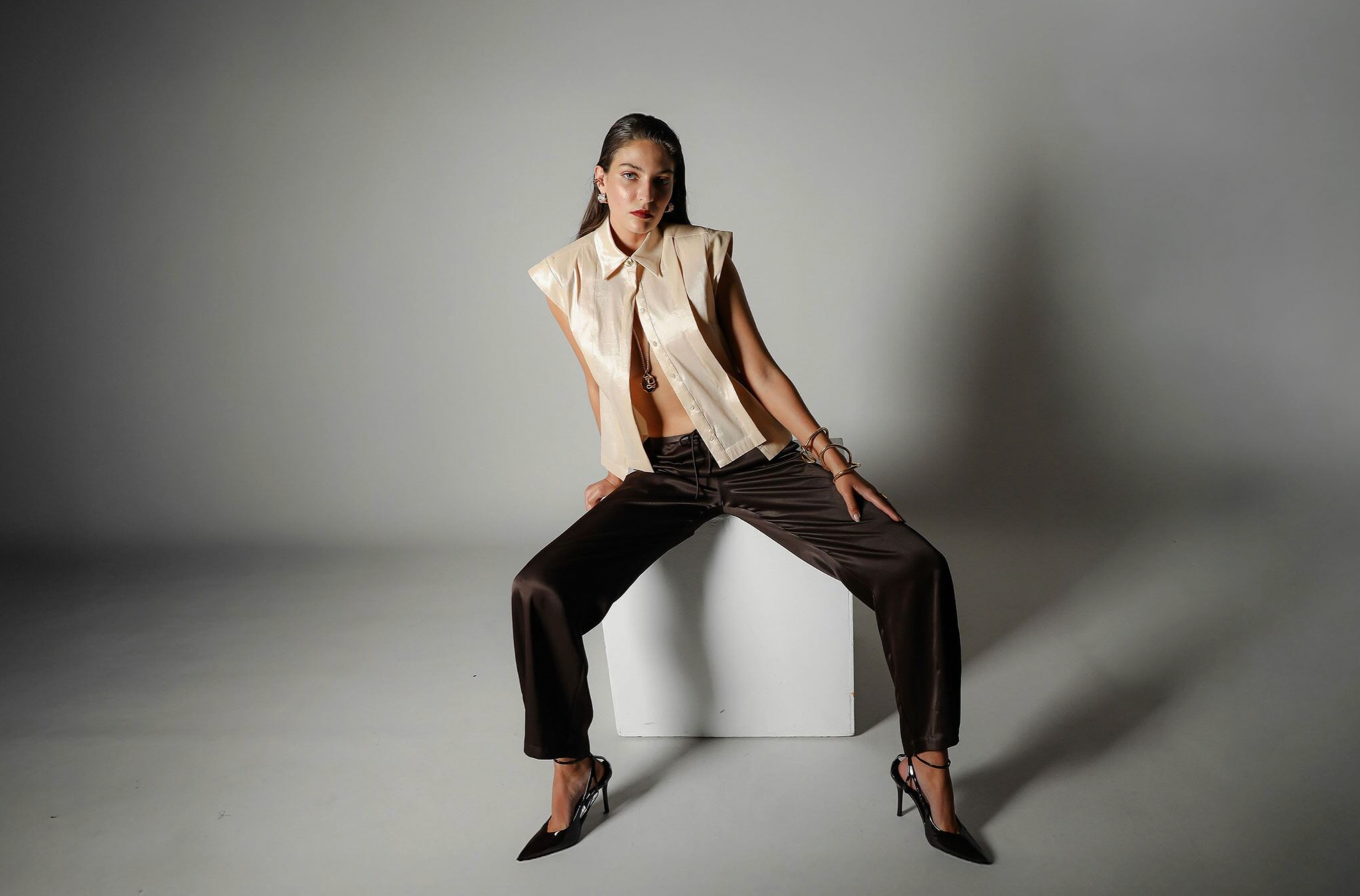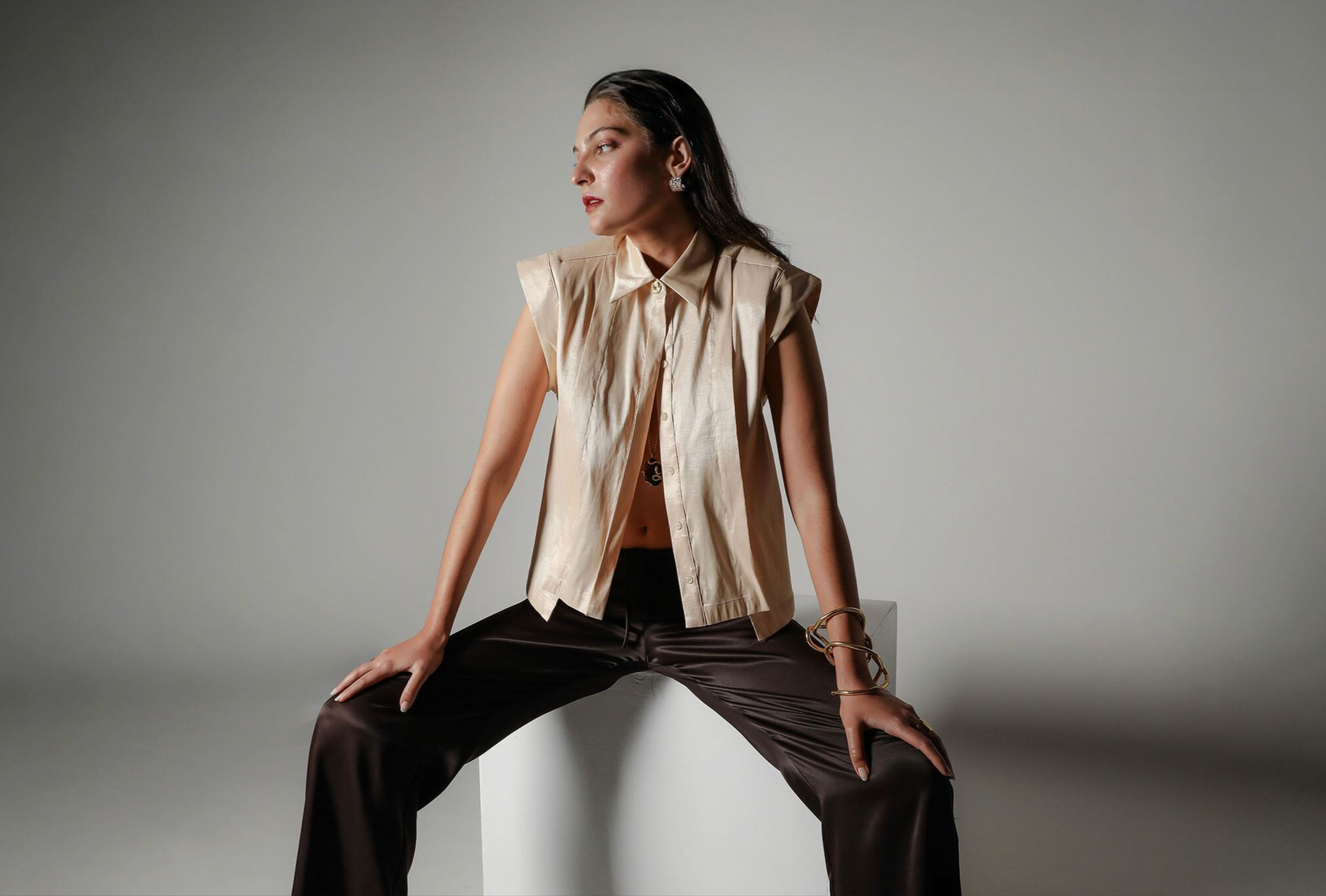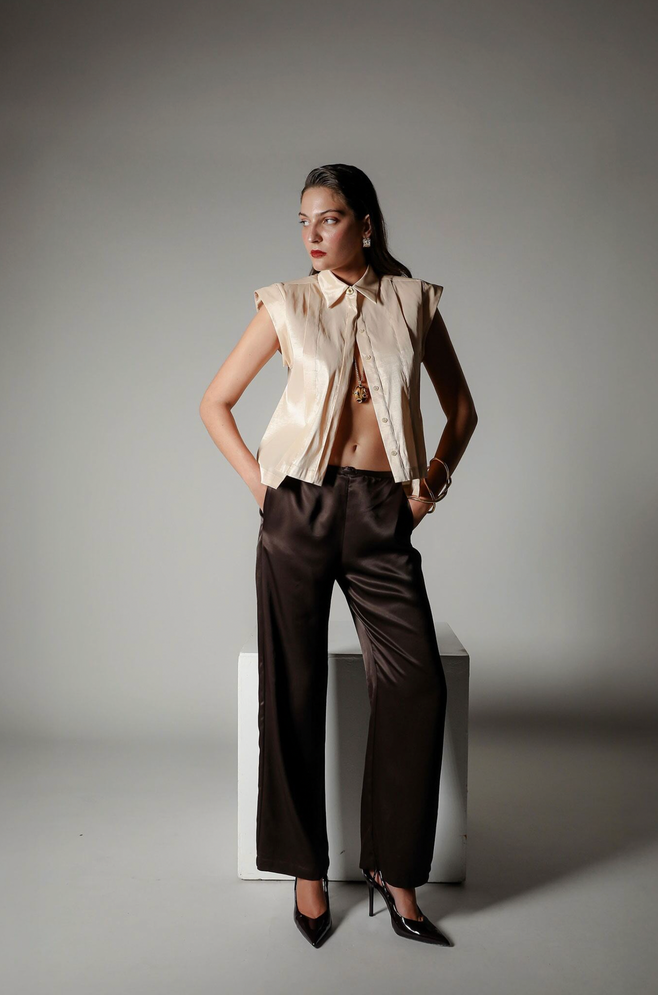 A piece that balances sculptural strength with refined minimalism. The Sol Verite Shirt is cut from luminous taffeta material, featuring subtle shoulder pads and front flange pleats that create Realm Origin's signature sharp, tailored fit. A concealed front button closure, step hem and back vent introduce ease and movement, softening the structure. The result is a piece that feels strong, feminine, and distinctly modern.