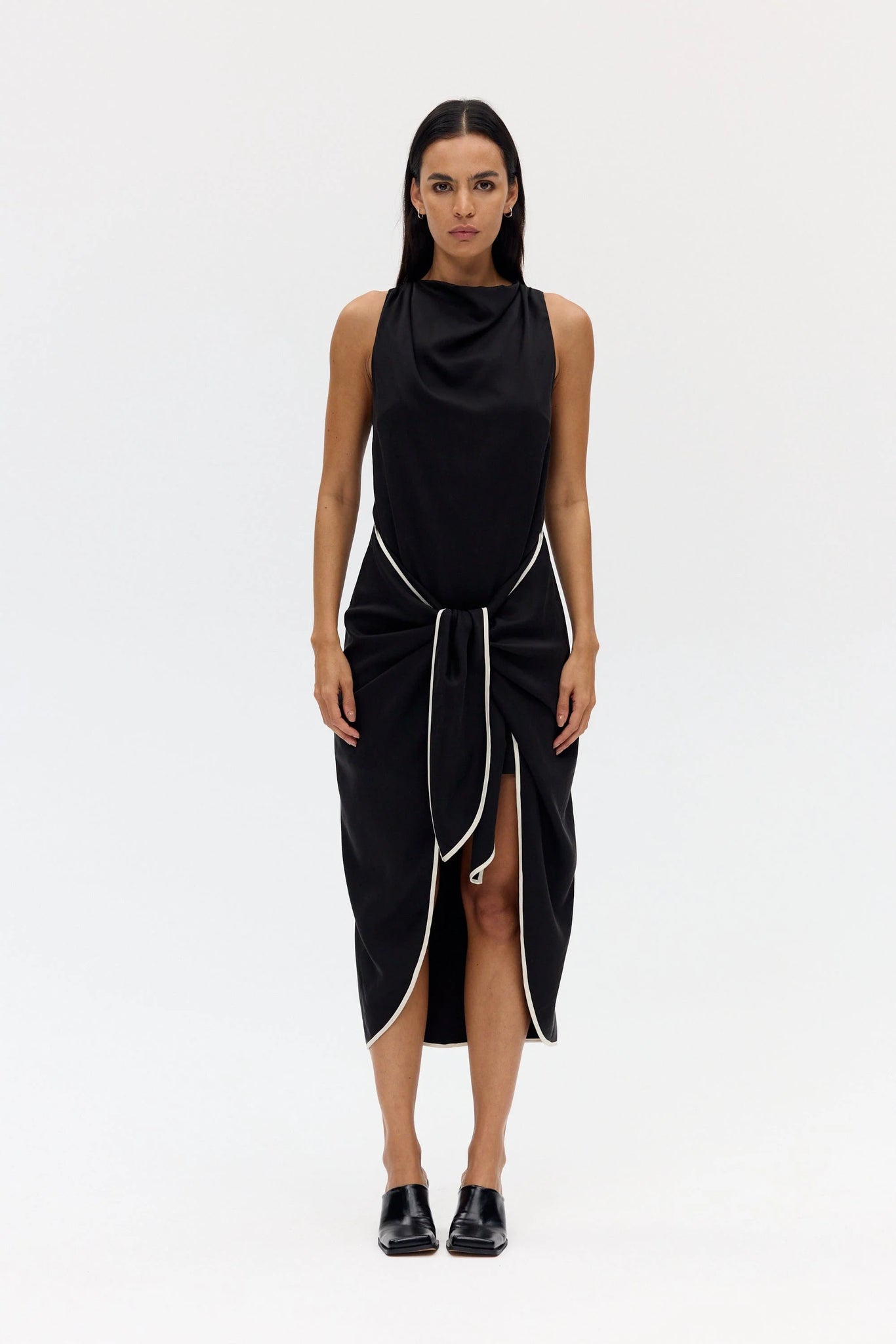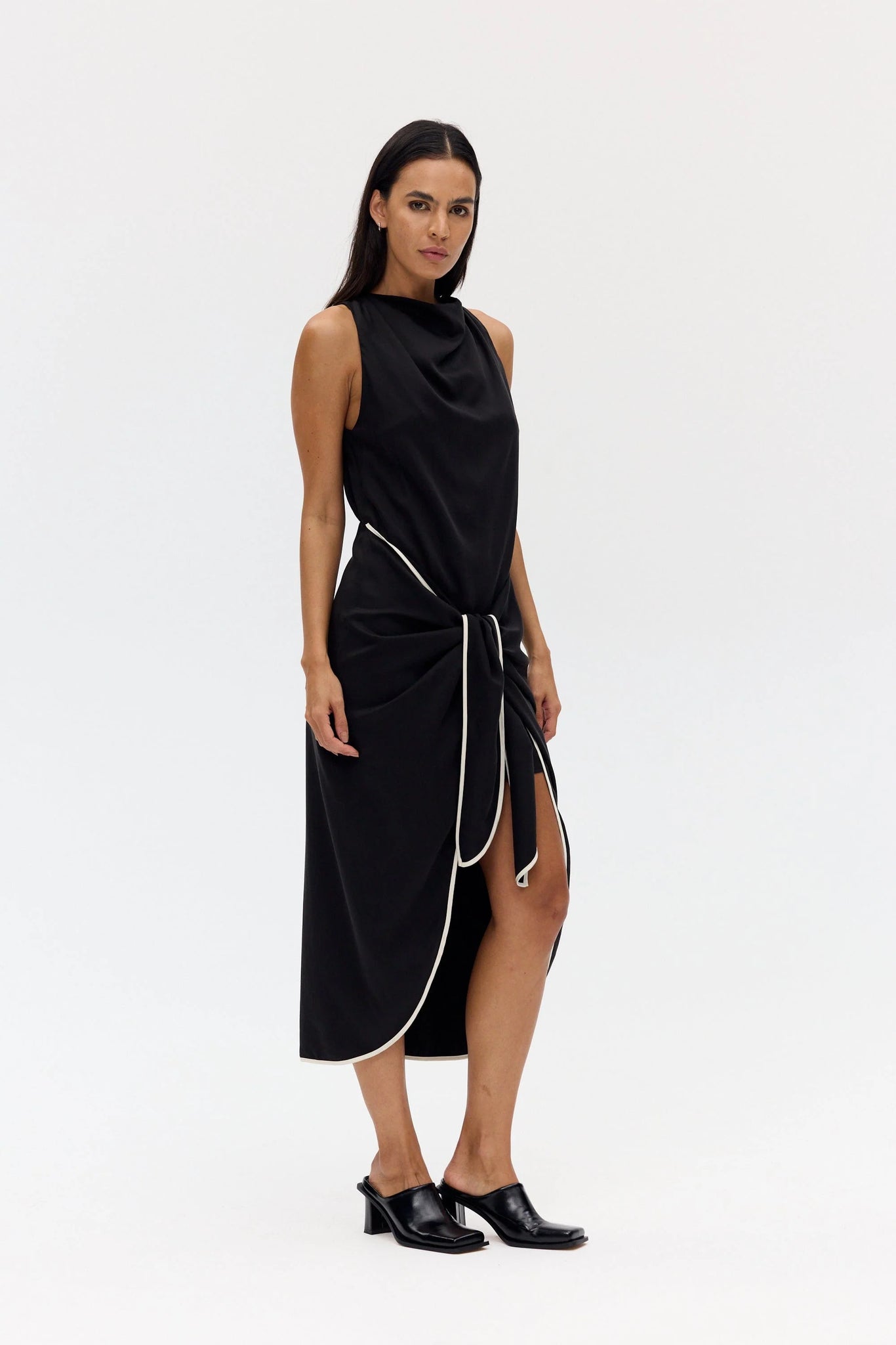 The Linger Tie Midi Dress is defined by soft drape and considered detail. Featuring a high neckline with subtle tucks through the shoulders, the silhouette falls with ease to a tie-front skirt that creates shape and movement. A contrast bind traces the edges, highlighting the wrap detail and adding a refined point of distinction.