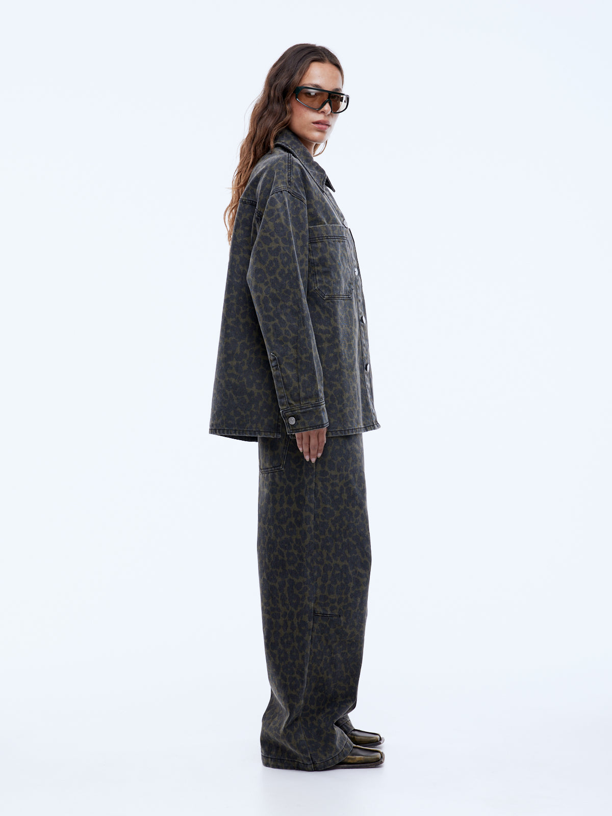 The Evie Denim Overshirt is cut from cotton denim with an oversized silhouette and dropped shoulders. Designed with patch pockets, shank button detailing and a dark tonal leopard print, it delivers bold layering with modern attitude.