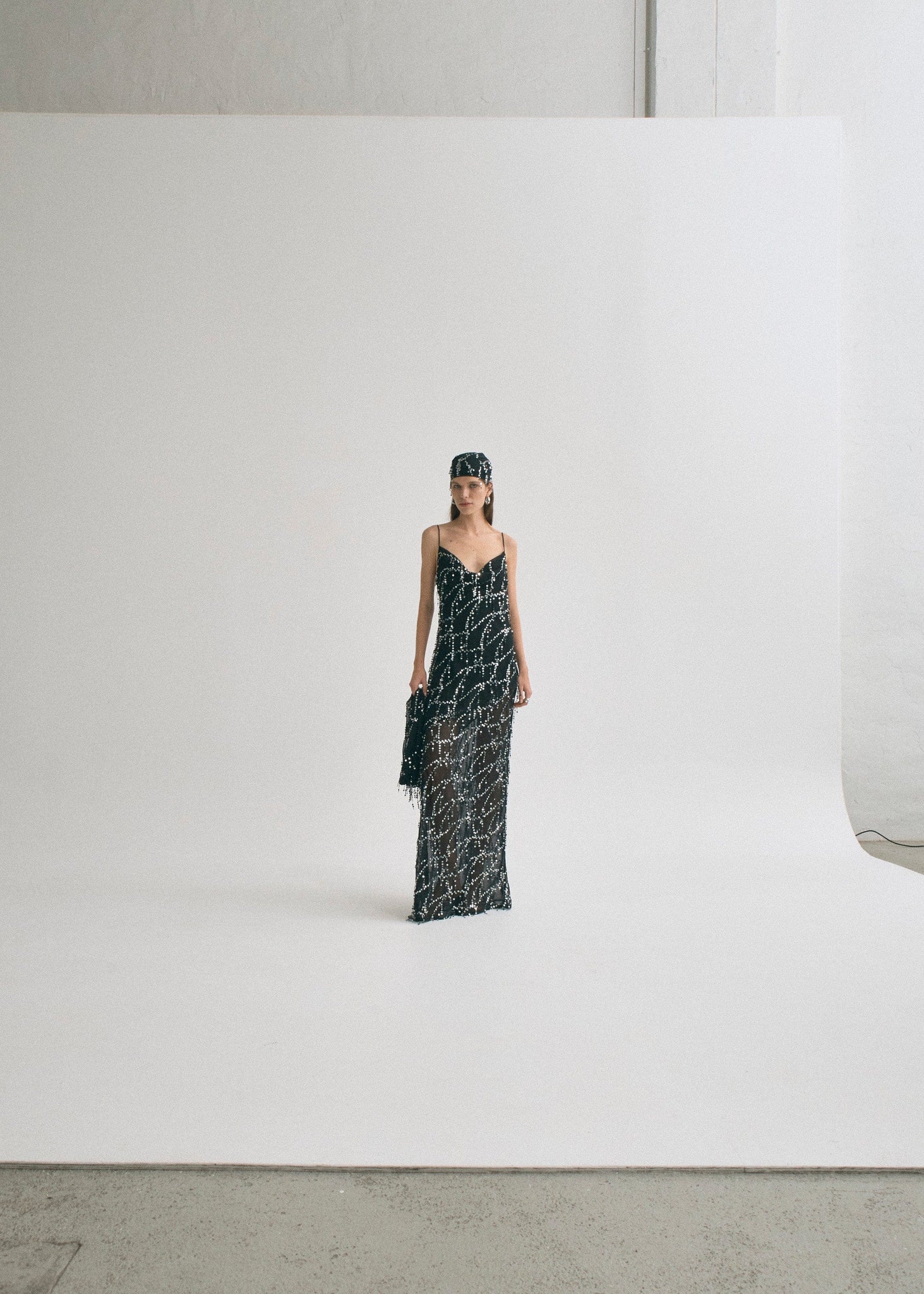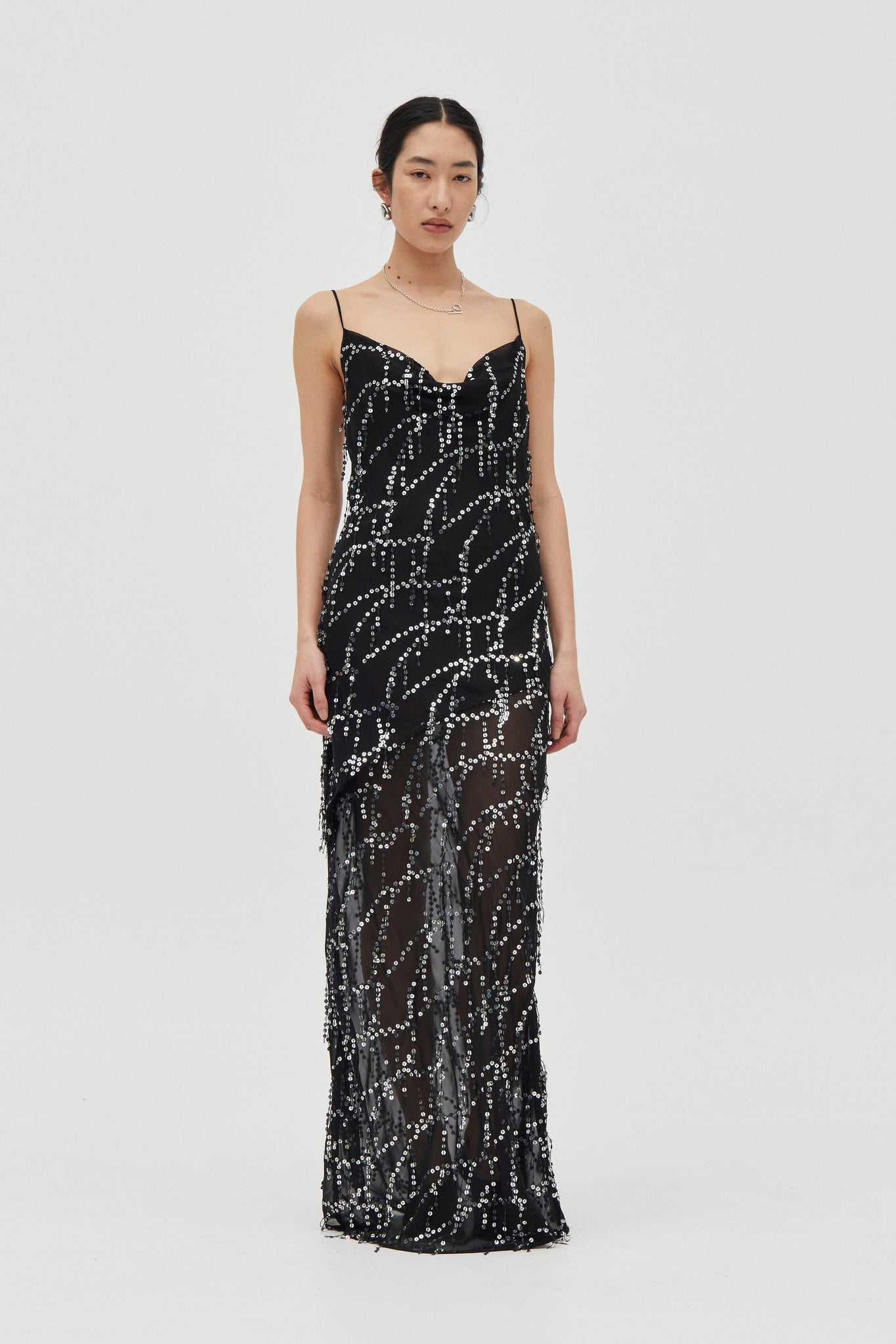 The Refract Bias Maxi Dress is crafted in a sheer chiffon embellished with silver sequins, exclusive to THIRD FORM. Cut on the bias for a streamlined fit, it features a softly draped cowl neckline and rouleau straps for a delicate finish. A shorter outer layer with an asymmetric hemline creates contrast and dimension, while the lower half remains unlined to highlight the lightness of the fabric.