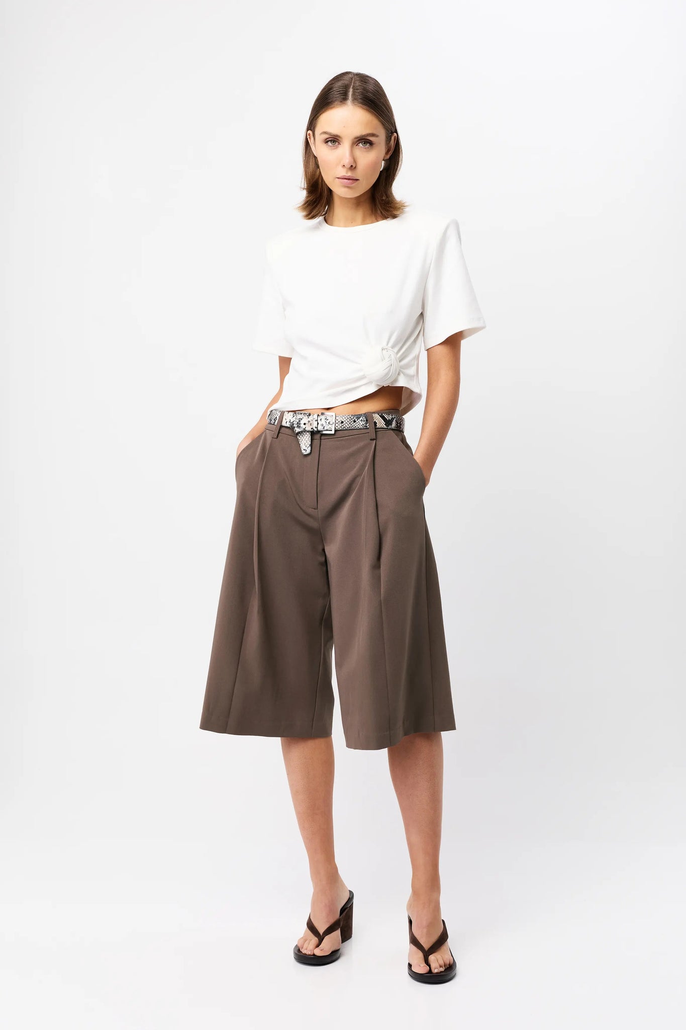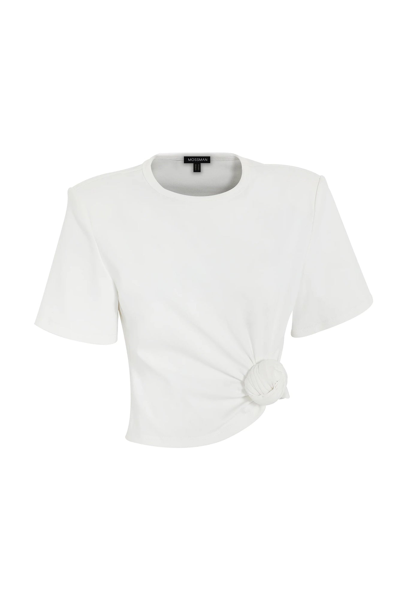 A modern rework of a wardrobe staple. The Tied & True Top in White is crafted from a premium jersey fabrication with a smooth, structured hand feel. Featuring a hand-sewn fixed knot detail, this short-sleeve style is finished with an asymmetric hemline that adds subtle shape and movement. Designed with shoulder pads and a round neckline, it brings a refined edge to an everyday essential.